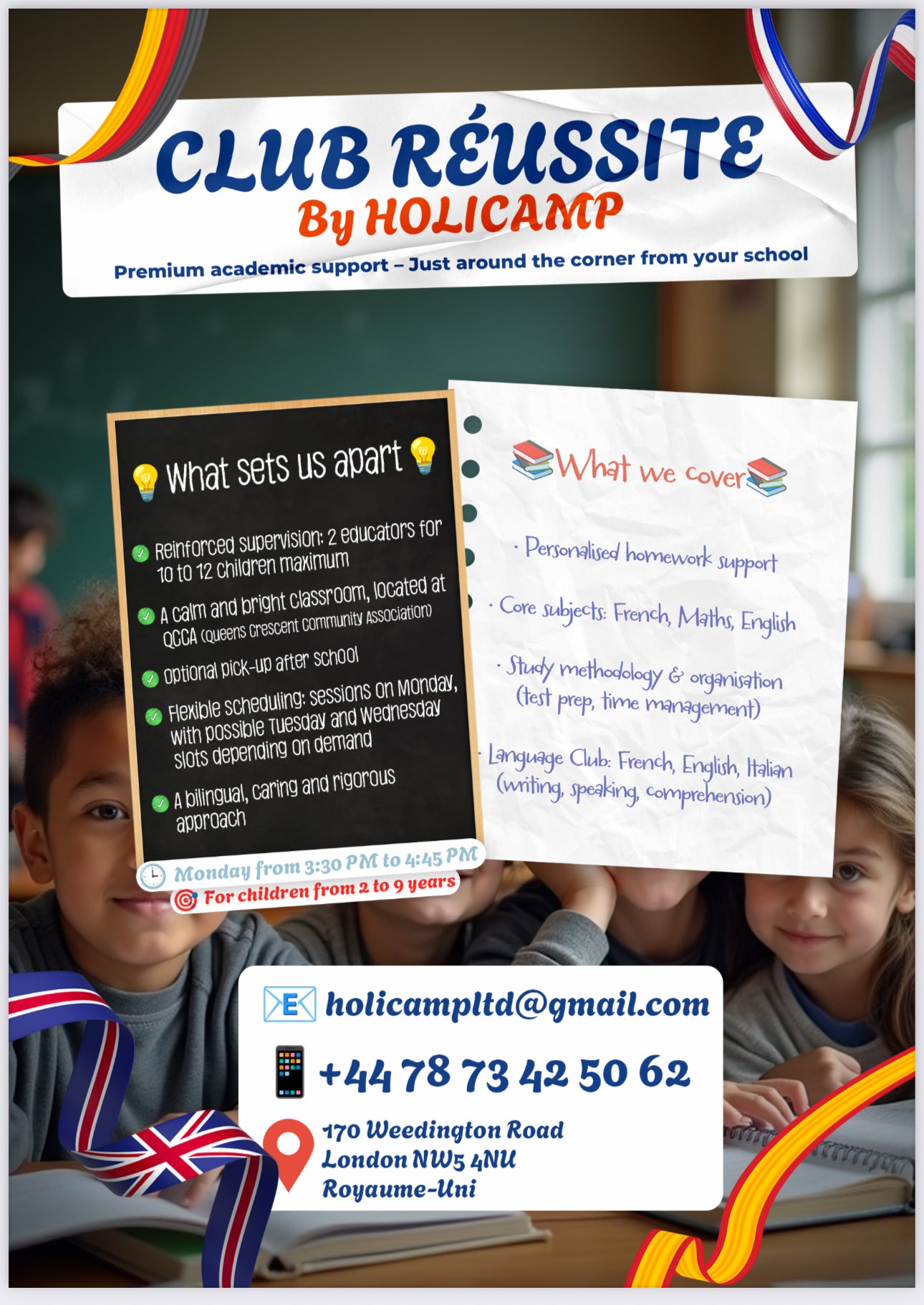 Club Réussite is designed to help students with their homework and strengthen their academic skills. Each session begins with a snack, followed by focused academic support in small groups, supervised by experienced teachers.